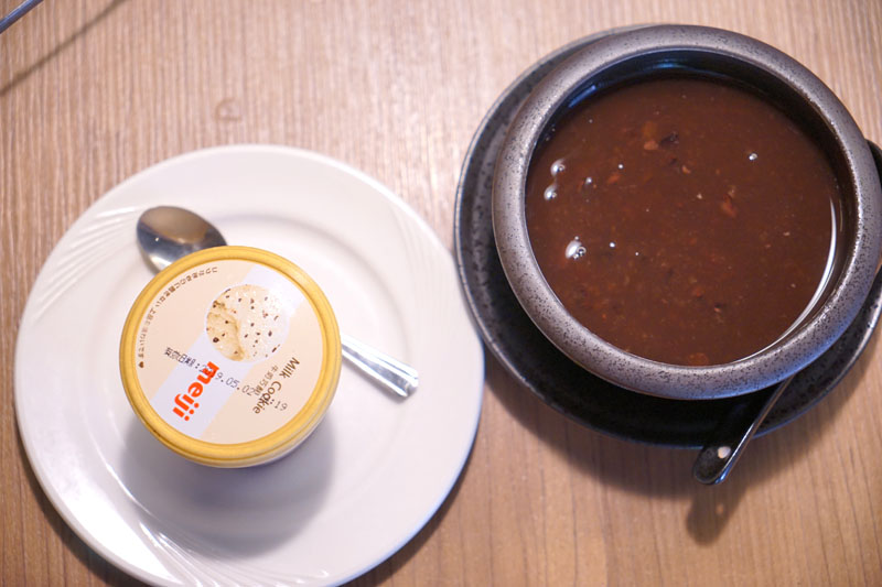飯後甜點可以選三種,有奶酪、冰淇淋與紅豆湯,最後我們選擇後面兩者,紅豆湯雖然是熱的,但裡面組合豐富,還能吃到珍珠耶!冰淇淋則是直接跟大品牌進貨。