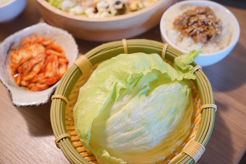 這是可以包肉的生菜,左邊還有韓式泡菜,可以搭配肉一起食用,不過泡菜有點辣,不吃辣的朋友要注意。