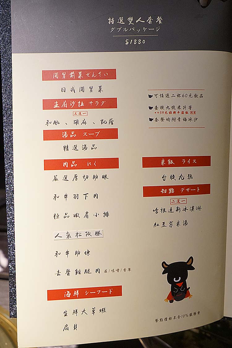 就坐後,點了特選雙人套餐,價位要1880元,這邊都是以套餐的方式呈現,價格最高的到2680元,每份套餐基本上都會有6種肉品在搭其他的項目。