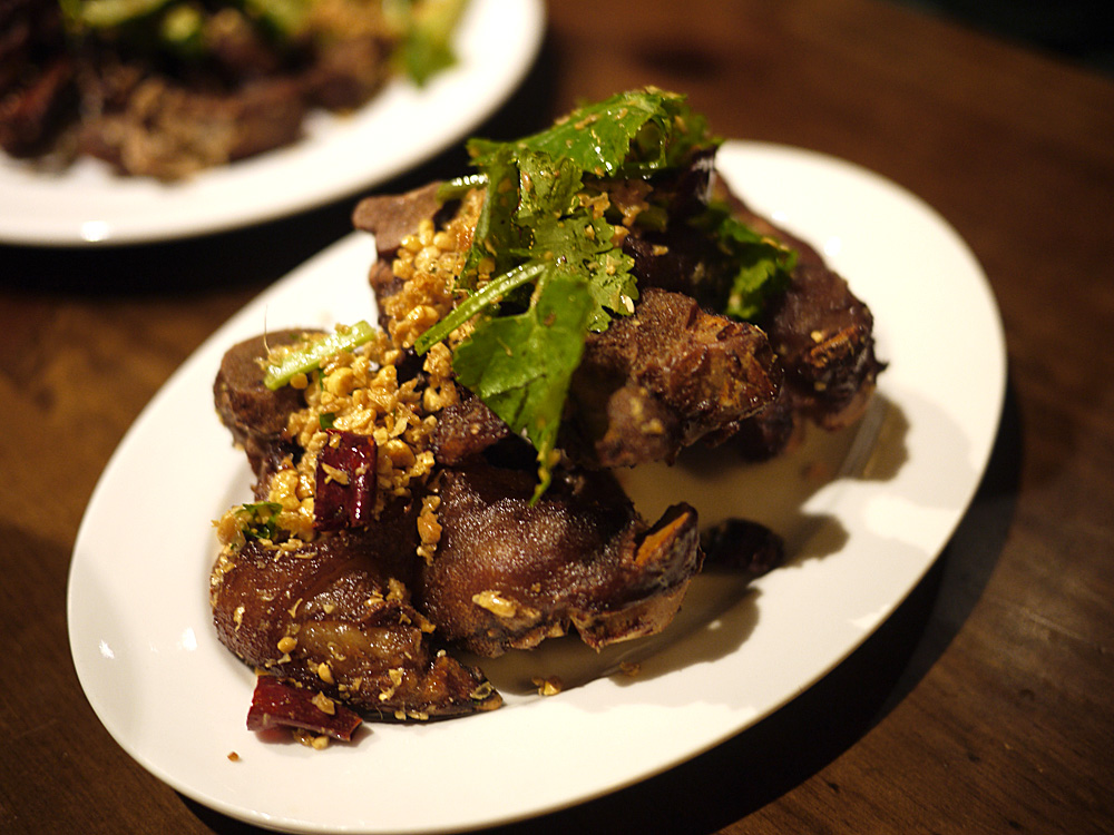 首先上菜的是他們的避風塘豬腳,結合避風塘炒蟹的作法,把原本QQ軟軟帶有膠質的豬腳,搖身一變成為酥酥脆脆帶有十足香氣的特殊料理,而且挺開胃的,沒吃過這種料理方式的蠻推薦可以嚐嚐。