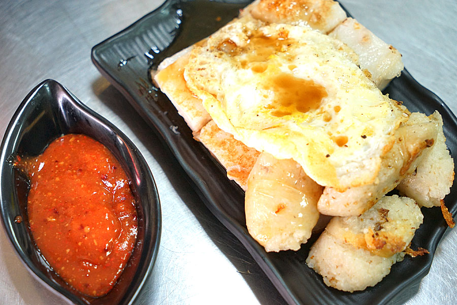 招牌小菜,有菜頭粿加米腸加蛋,你以為只有這樣嗎?實際上應該算是四吃了吧?裡面其實是芋頭糕再上層,蘿蔔糕在下層,現點現煎,左邊的醬帶點甜味,有種南部上來的感覺,若要吃比較辣些的,則可以去加桌上的辣醬,想吃甜吃鹹吃辣通通都可以。