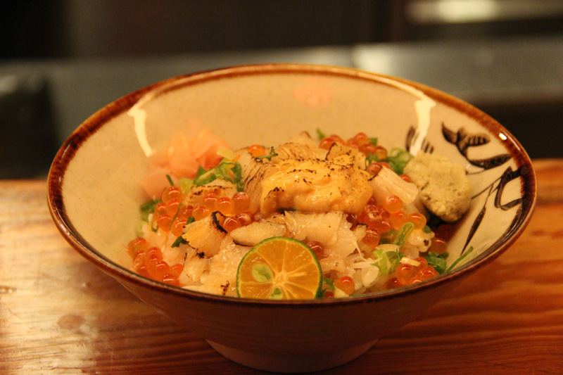 這一碗海鮮炙丼(420元),是熊同事點的,魚是屬於比較豐富油質的,味道比一般的生魚片還要厚,鰭邊肉一開始吃起來不會覺得是魚肉,反而脆脆的,記憶中,比目魚的鰭邊肉屬於高級食材,同事也蠻喜歡這一道。