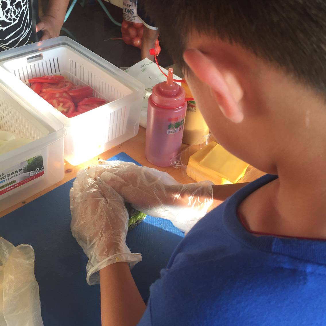 小朋友自己動手做漢堡的情境。