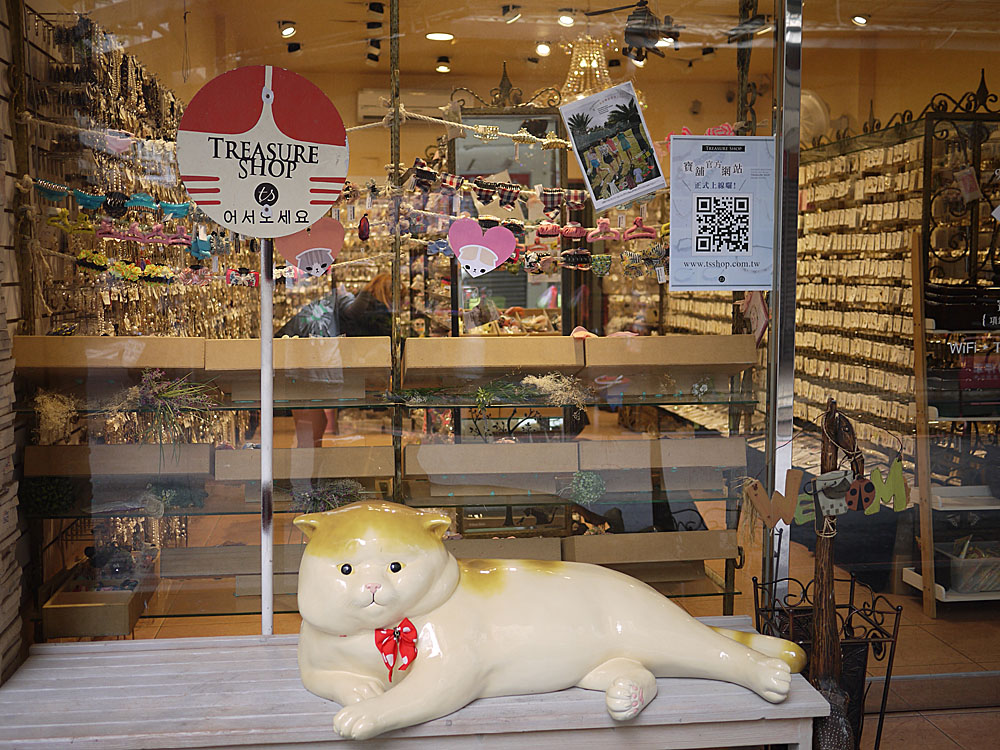 寶鋪是以飾品店起家的,後來才開始多了黃金炙燒吐司的品牌,其中一家店門口很好玩,還有一隻肥嫩嫩的貓咪與站牌,路過的遊客都可以跟他拍照。