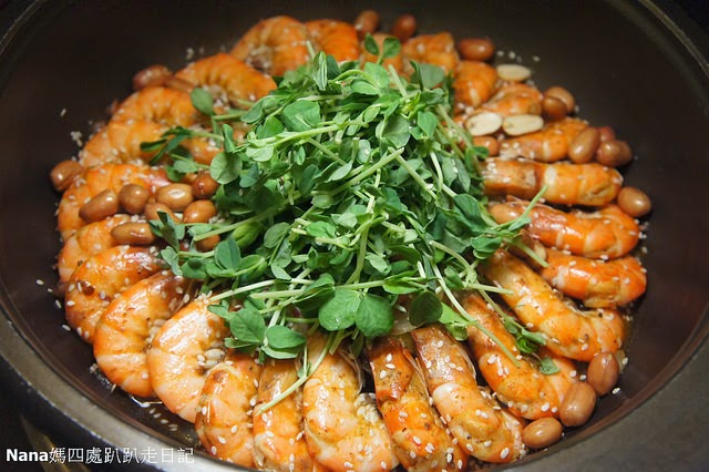 十八香蝦鍋,你看! 店家沒有畫虎爛(台語),MENU圖片跟實品對照一下,一模一樣料好實在,童叟無欺,記得要拿湯匙稍微翻動一下才不會底下燒焦,底下藏著不少大蒜、洋蔥、花生、九層塔,攪拌翻動的時候飄出誘人的香味(聞到都好餓)。