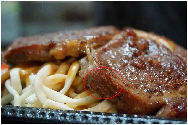 突然發現隔壁桌的肉好大一塊,立馬詢問是否可以讓小凉拍一下,想不到郎客也點頭說好呢,這是A級沙朗厚片,你看看小凉圈起來的厚度一點都不誇張,這厚度有兩公分左右。