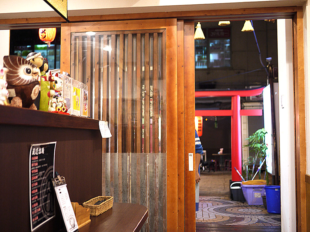 門是左右移動的木門,要關門時才注意到原來門口還有放置仿日本的鳥居裝置。