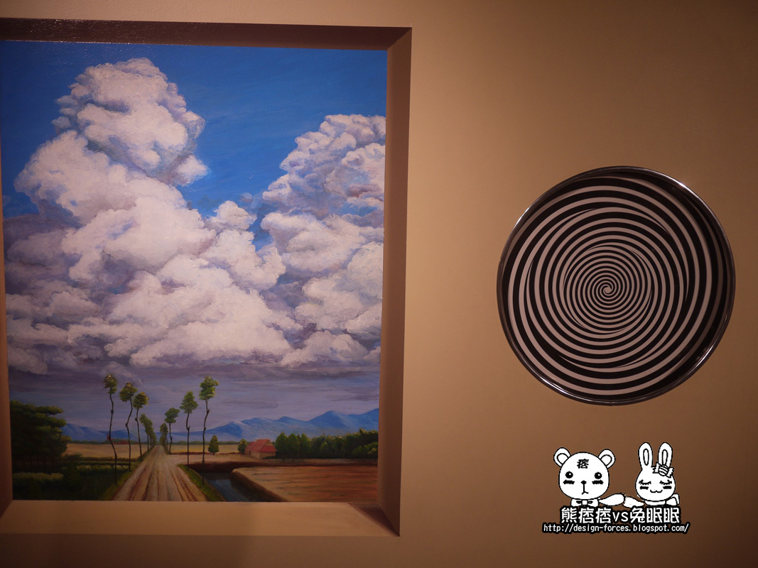 這邊的展場真的跟一般的藝術展很不一樣,大家來這邊的目的,應該都是與圖片互動拍照吧,很多作品都是平面的,卻沒想到可以營造出3D立體效果,真的很厲害,疑!兔眠眠妳怎偷偷去扯別人的毛毯啊?等等害人摔倒怎麼辦?