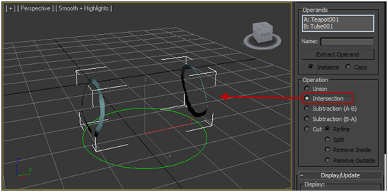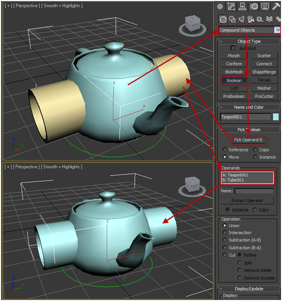 點選Teapot(茶壺)進入Compound Objects內,選擇Boolean布林運算後,點選Pick Operand B指定連接物件B為Tube物件,而後將產生第一種效果。