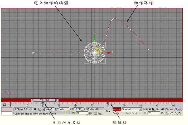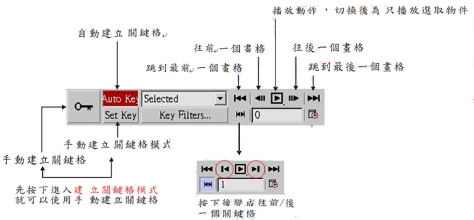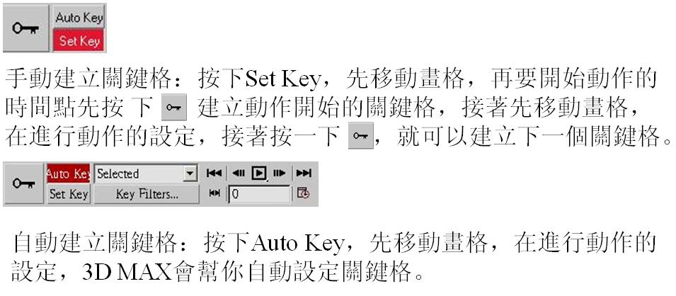 在3D動畫的設定,則是以關鍵格的指定來完成,先設定好妳要的動作張數,再對物體作妳想要作的動作,經由開啟動畫鈕,軟體會記錄妳物體的變化,再經由播放即產生動畫效果。