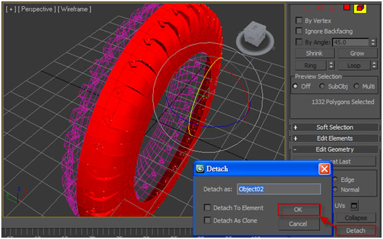 將物件重新轉換成poly,並選取半邊輪胎後,按Detach分離物件。