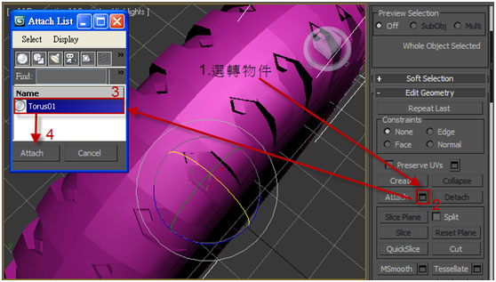 將分離出的輪胎進行一次旋轉,使兩邊輪胎凹槽錯開後,利用Attach將物件焊接起來。
