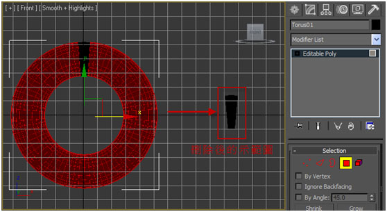 於前視圖(Front)中進入面級別,選擇中間兩環形的面,然後按Ctrl+I鍵反轉,並刪除。