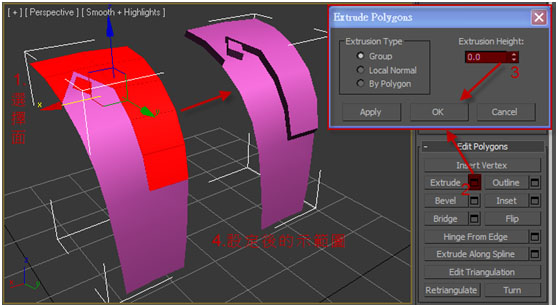 進入面級別,按住Ctrl鍵並點選想凸起的面,執行Exturde命令,輸入想要的數值向上擠壓,確定數值後即可按OK定型。