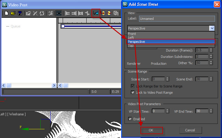 Scene Event跳出新視窗,並選擇自己想要觀看的視窗,我們假設為Perspective,而後按下ok。