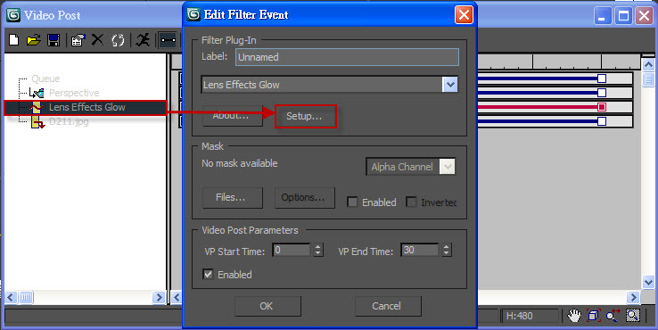 連點兩下左邊的Lens Effects Glow跳出視窗,並按下Setup。
