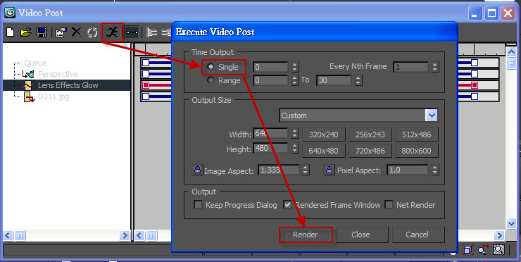 回到Video Post模式下,點選小黑人跑步的圖示,選擇單圖運算,在按下Render。