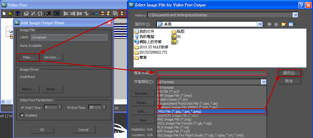 選擇Select Image Output Event跳出視窗,點選Files跳出儲存視窗,並依需求選擇存檔類型。