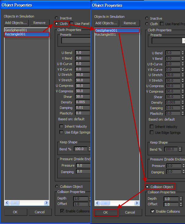 接著分別賦予Object Properties內物件不同的特性,首先點選布料物件Rectangle001勾選Cloth布料屬性、在點選GeoSphere001勾選Collision Object設為碰撞對象。