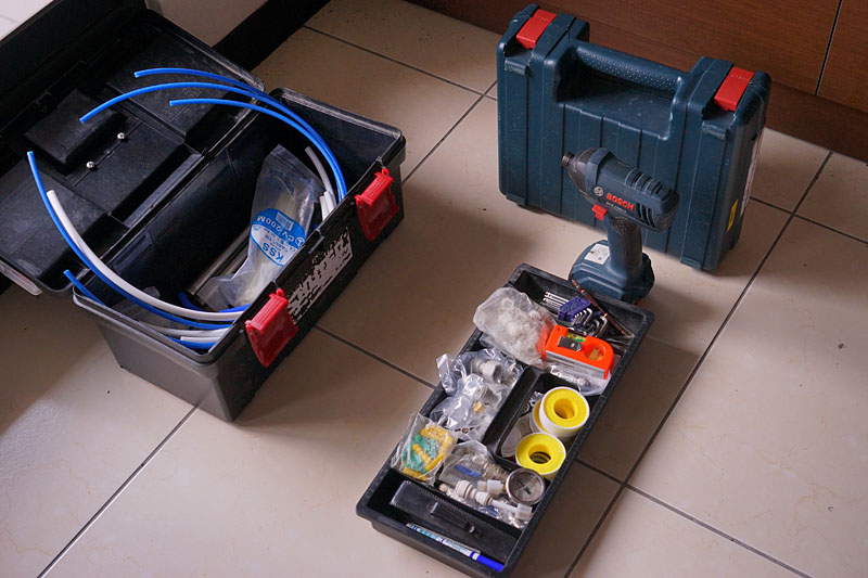 上面的鵝頸龍頭搞定後,下面也要把濾水器做固定,固定前的樣子如上,師傅會跟你討論要放在哪邊。