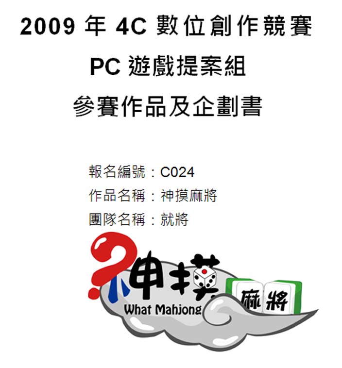 2012.01.30 【4c遊戲企劃】神摸麻將 未分類 Tweet 這是2009年參加4C數位競賽的作品【神摸麻將】,該遊戲企劃文案+美工,約一個月時間撰寫完畢,本文僅供學術參考,請勿任意盜取,詳細的遊戲企劃請參閱內文。 遊戲基本概述 市場分析