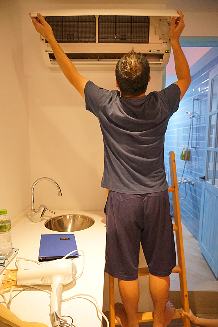 「喔對了!如果冷氣壞掉,還可以自己充當水電工,拿剛剛的衣架(誤)梯,就可以自己修。」