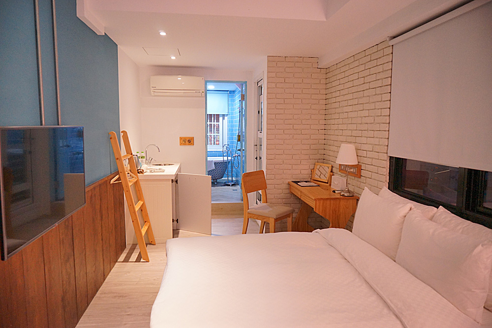 先給大家看一下這個空間,基本上該有的都有,冰箱、冷氣、電視、辦公桌、沙發桌等等,唯一沒有的是老闆不會閒閒沒事陪你睡,請安心。