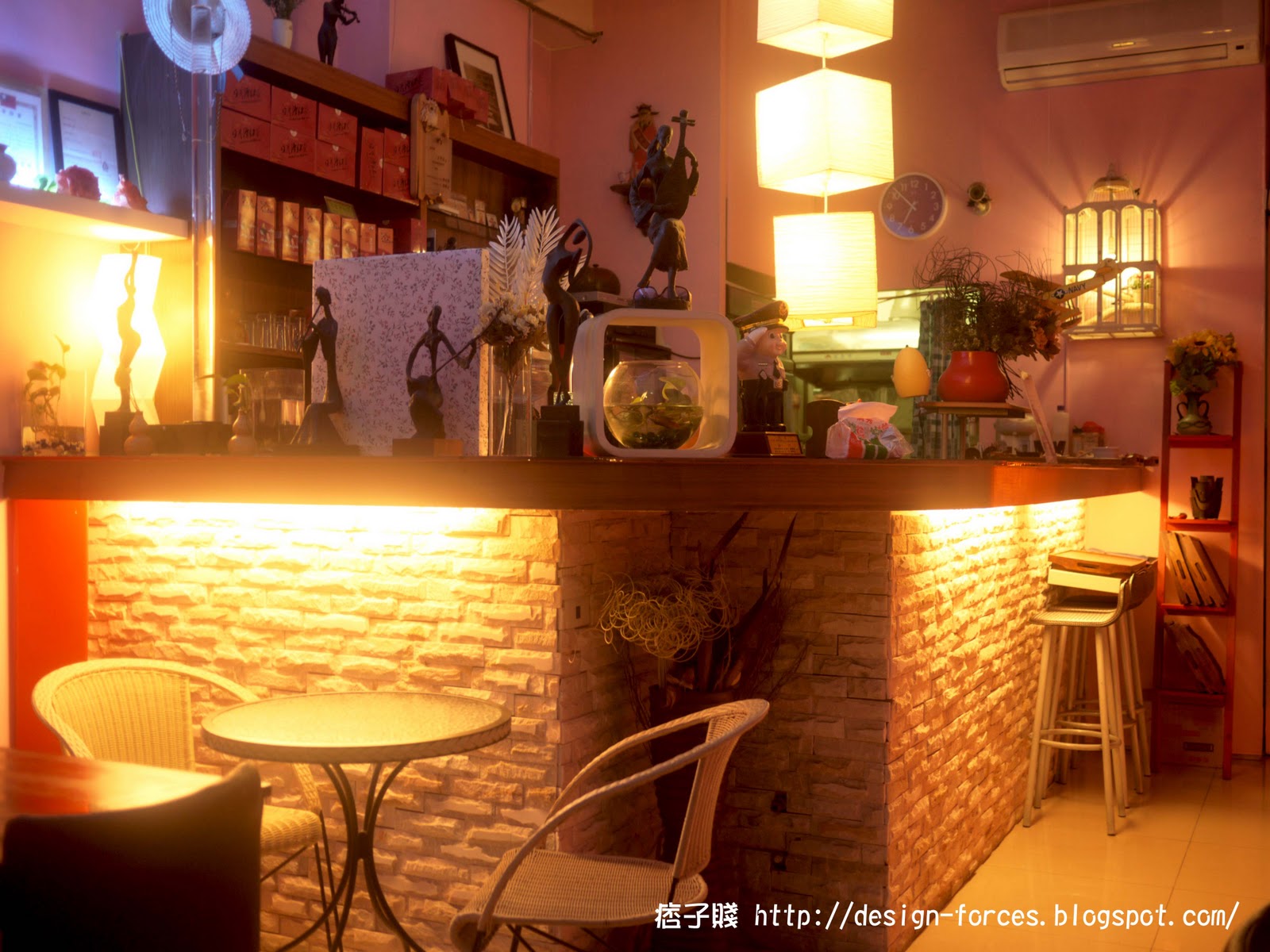 晚餐時間到了,老闆貼心的提醒我們要下來吃飯哩!櫃檯擺滿了許多藝術品。
