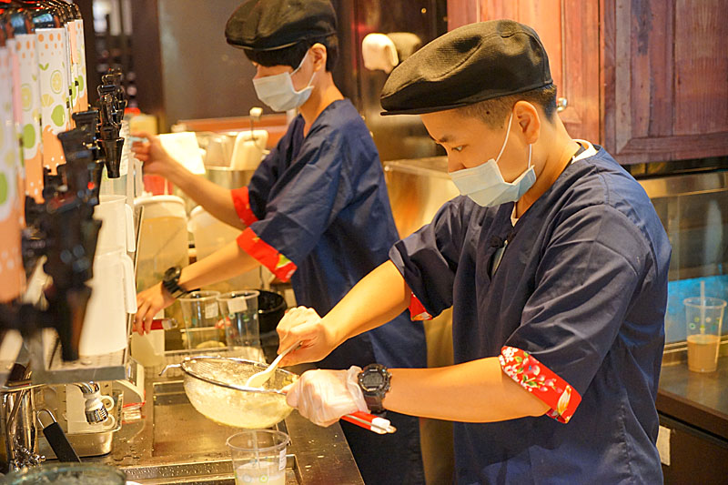 裡面的員工已經各自分工的在準備食材與製作,單單一家飲料店,製作人員卻不少,差不多有六位,有人負責切洗水果,有人負責做飲料,有人包裝核對,有人則在櫃台處理訂單。