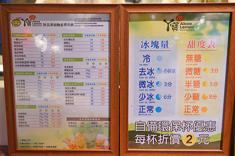 這裡的飲料還有糖量標示表可以參考,冰塊與甜度都可以選擇,若自備環保杯每杯可折價2元。