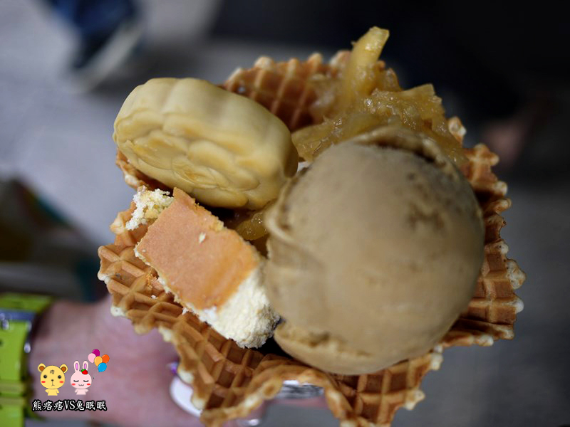 這邊的冰淇淋還可以家配料,如果是點兩球的,可以加上四種料,連土鳳梨酥都有是哪招?