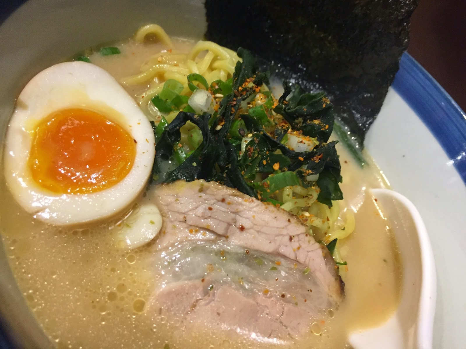 漂浮的糖心蛋及叉燒肉,麵的上方放著稍微乾燥的海帶,
