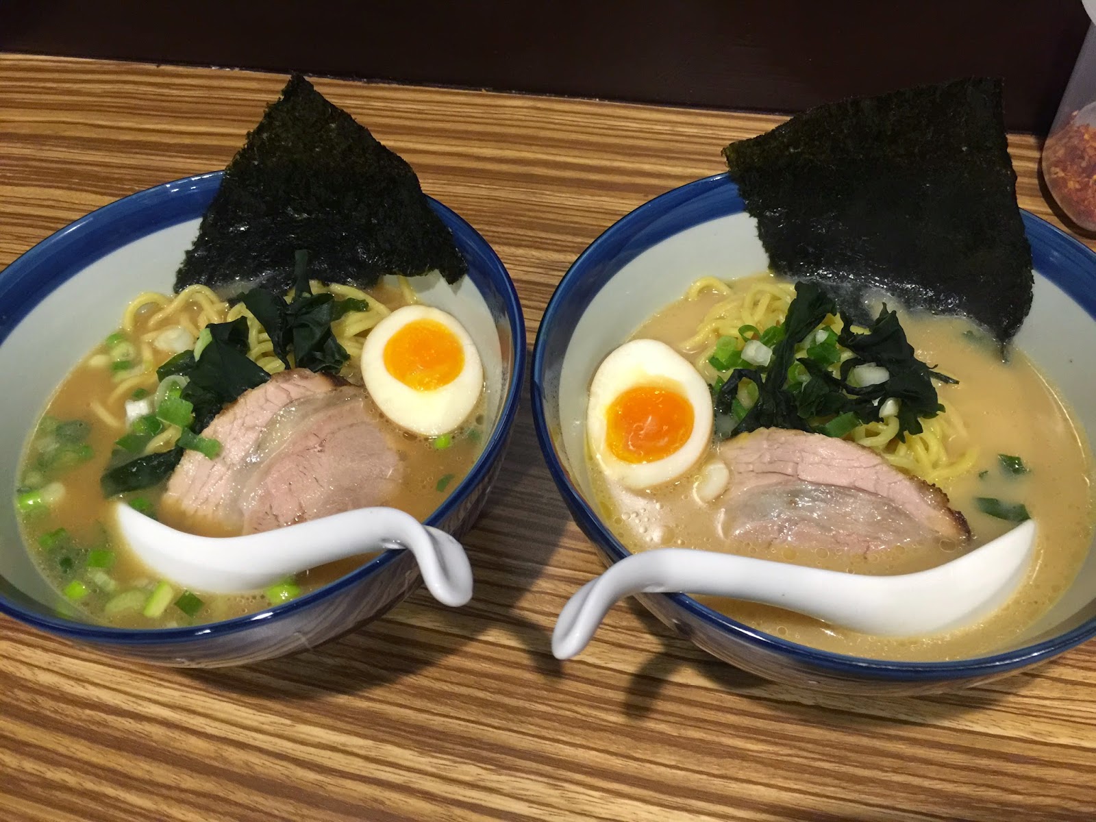 熱騰騰的拉麵終於上桌囉!左邊是味噌湯底、右邊是豚骨湯底