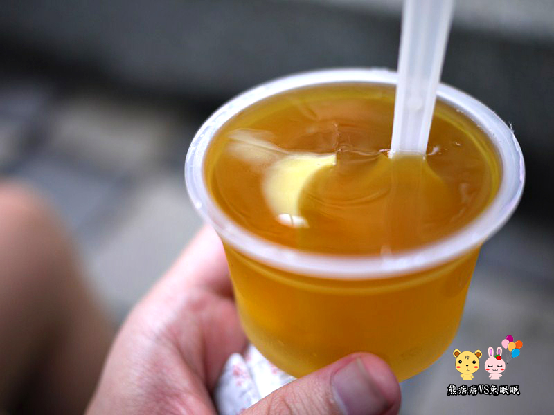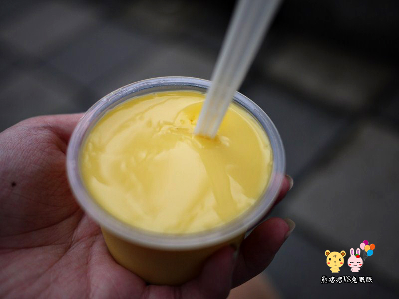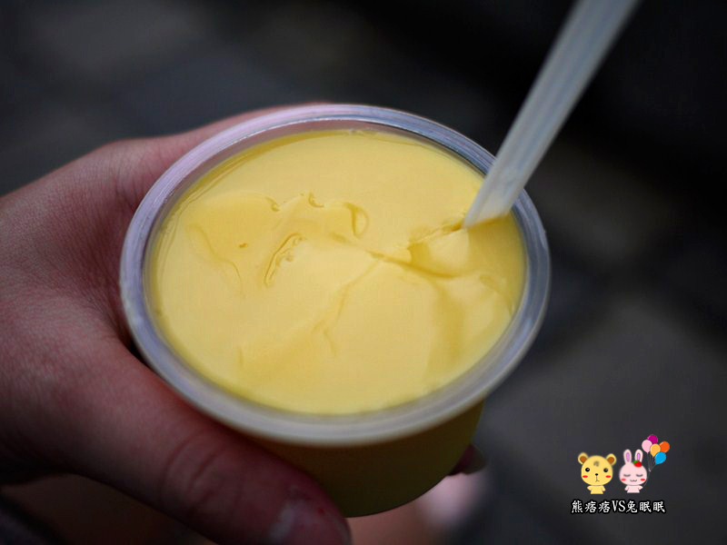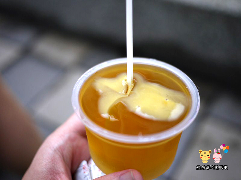 等了一段時間,終於排到我們,這邊的價格一碗都在35以上,首先拿到的是爆漿茶凍,老實說,茶凍吃起來還蠻一般的,噱頭只是在名字上,老闆一直強調只要輕輕化開就會爆漿了,可是實際用起來根本沒爆漿阿 (/‵Д′)/~ ╧╧。