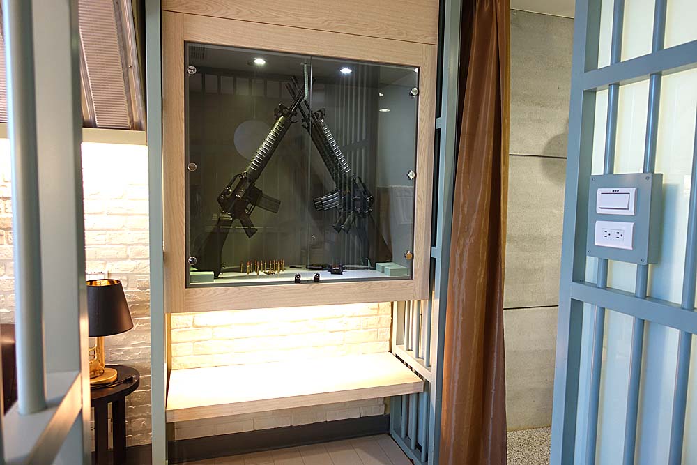 房間空間足夠活動,牆壁與櫥櫃上都有著一些槍械,房外還有小陽台可以曬曬太陽。