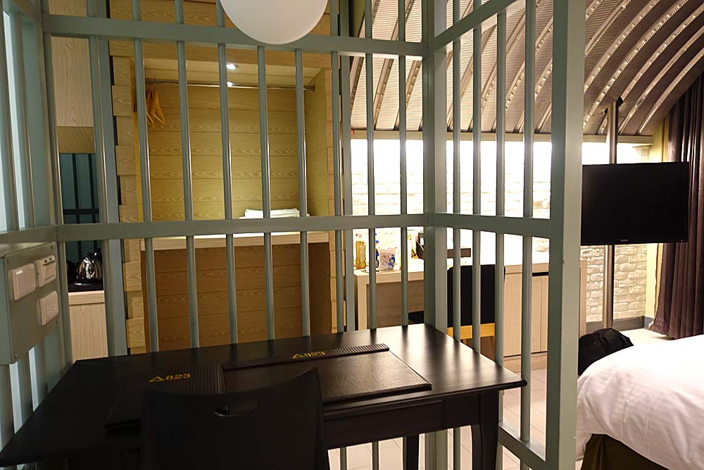 鋼鐵隔出的空間,某些層面上來說還蠻像小監獄的感覺耶,哈,不過跟其他飯店相比,這裡卻有兩個可以小辦公的地方倒是不錯,一到晚上桌電就直接拿出來用了!