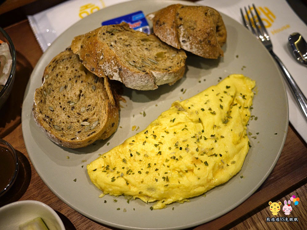 麵包的部分,聽說是用自行培養的葡萄菌種、啤酒酵母與魯邦菌種來製作,走健康自然路線,歐姆蛋捲的內在是屬於半熟的,刀叉小小一切過,還會流出一些蛋汁呢,個人是喜歡切成一小塊一小塊的,在放到麵包上面一起食用。