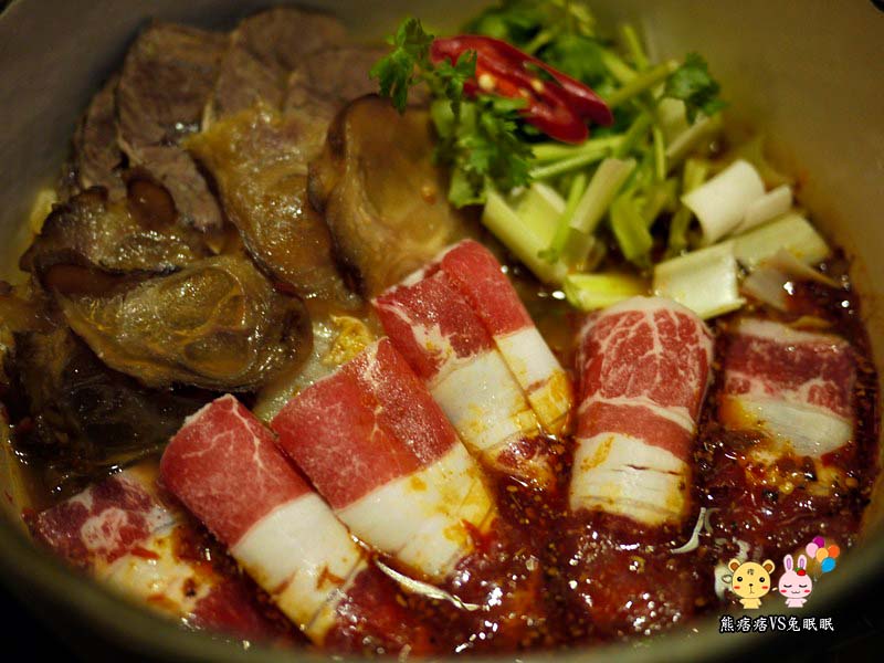 這是朋友點的湘味狠水牛燒,一開始上來時是生的,下去服務生則會幫忙開火水煮牛肉,裡面共分為生牛肉片與滷牛肉兩種,這道菜跟我的嗆辣蝦蟹干鍋相比,個人很推薦這一道,因為很下飯!