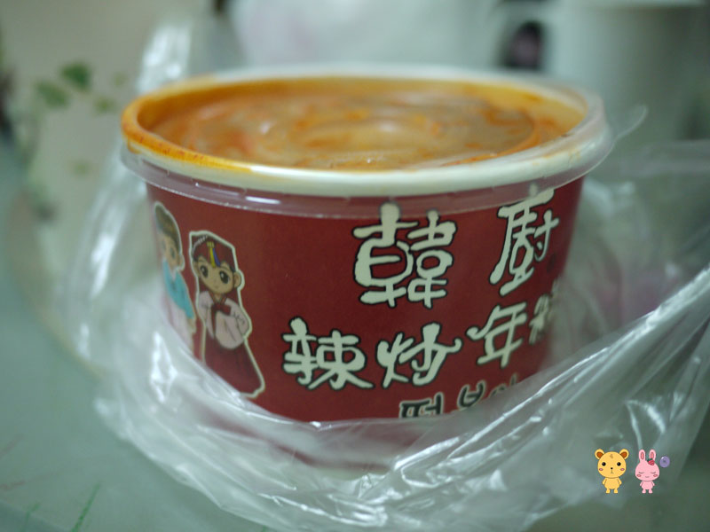買好後,就拿到這樣一碗韓廚辣炒年糕,外包裝很可愛,有一男一女的小韓國人。
