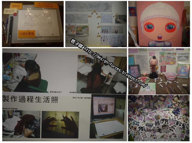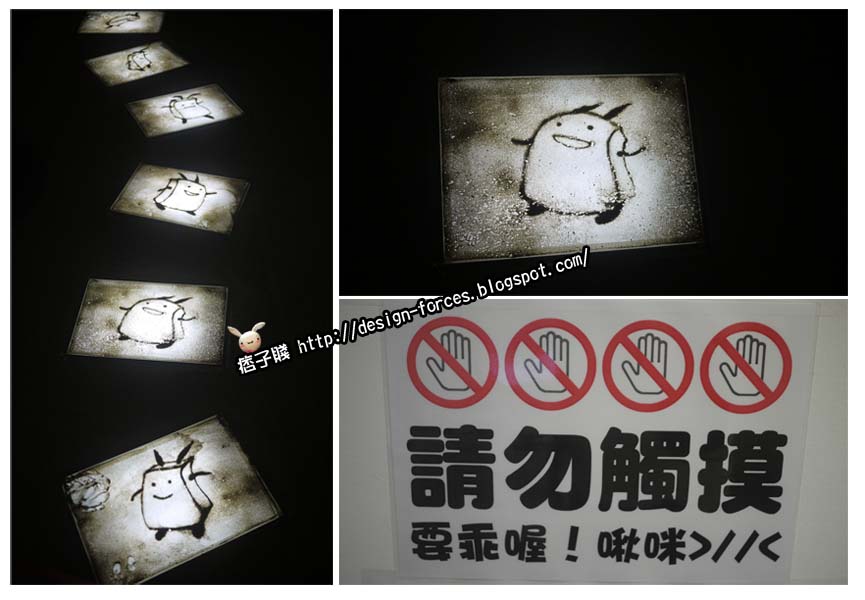 館內的空間沒有很大,不過作品挺豐富的,連告示牌都很有趣呢!要乖喔!啾咪>///<,糖寶貝看到的當下都笑了出來,而上圖中,類似地磚路的角色,是沙畫的作品,造型生動可愛,我想如果這樣的設計拿到森林中的小路,一定深受小朋友喜愛。