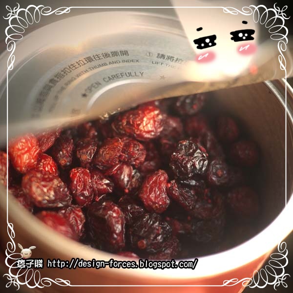 打開蓋子後,淡淡的莓香撲鼻而來,味道十分吸引人,可以發現,它們的蔓越莓乾是採用整顆不切片的方式,根據包裝上的資料,似乎是從加拿大進口的,賤賤光看到這就覺得,這些吃起來的品質上應該不錯。