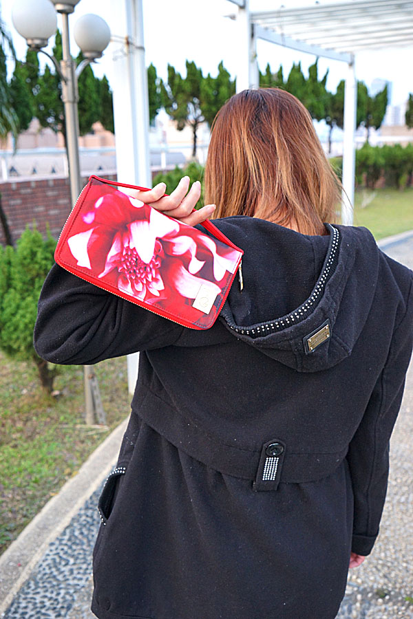 花朵造型的紅色手拿包,設計上也有小巧思。