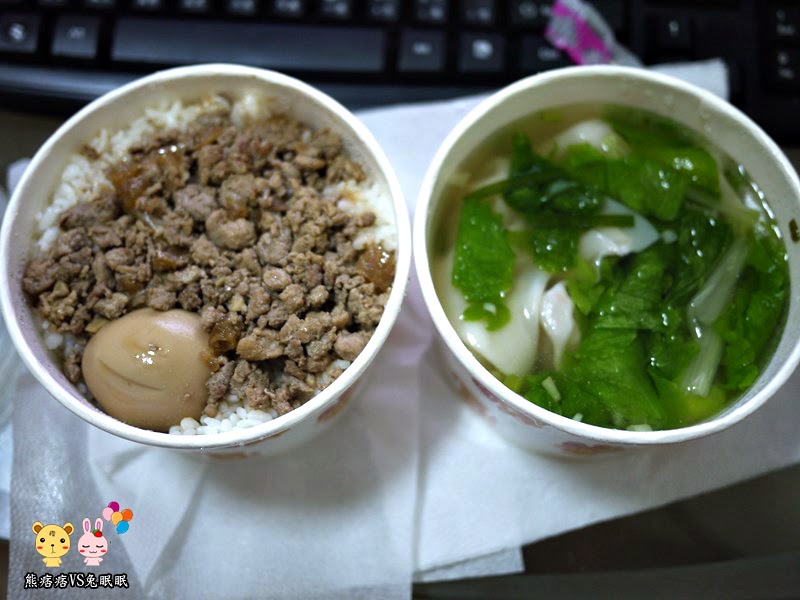 等到我的餐點好了,就自行帶回家吃,從左邊的肉燥飯來看,肉燥的份量很多,比起我家附近一盒40元還沒什麼料的好上幾倍!