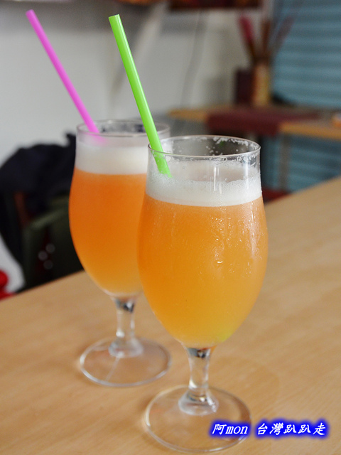 兩杯黃澄澄的果汁迅速的送上桌,這就是傳味60年的飲料阿,老闆說喝的時候要先攪拌一下,讓底下沉澱的水果纖維平均分佈。