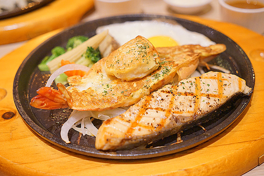 今天我們三人吃的排餐有三款,這是海鮮大餐 $580,裡面是由海大蝦搭配挪威鮭魚,其中的海大蝦表現的較好。