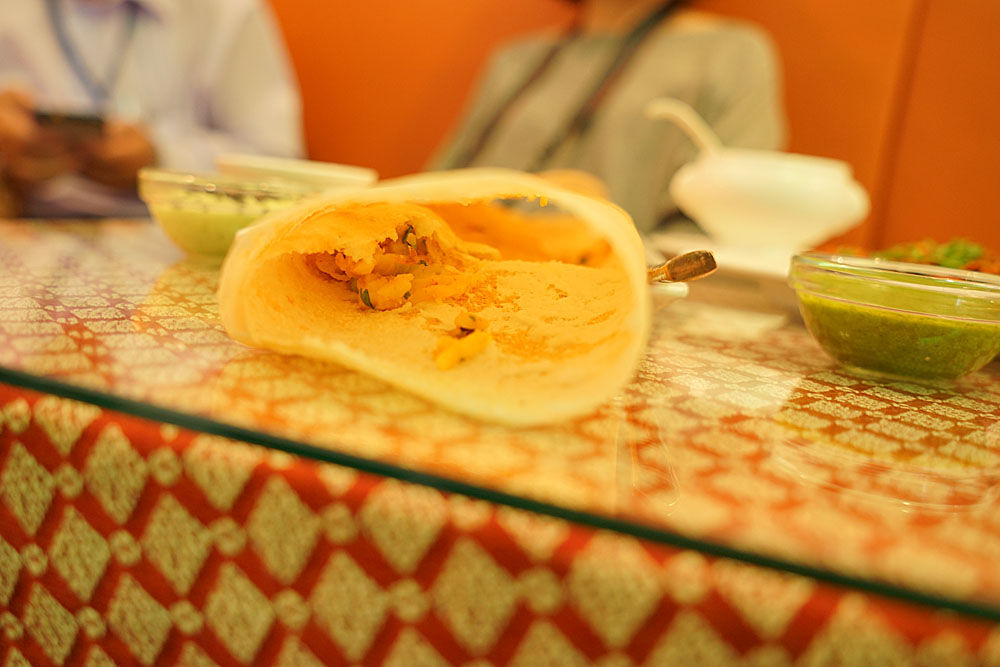 上面這道印式甜甜圈和印度米豆蒸糕我覺得也很特別,左邊的甜甜圈是鹹的,吃起來鹹香鹹香,裡面有小茴香、紅蔥頭與黃扁豆等,右邊則是印度米豆蒸糕,比較像是台灣發糕的感覺,建議可以搭配芥末子椰子醬一起食用,口感會更特別。