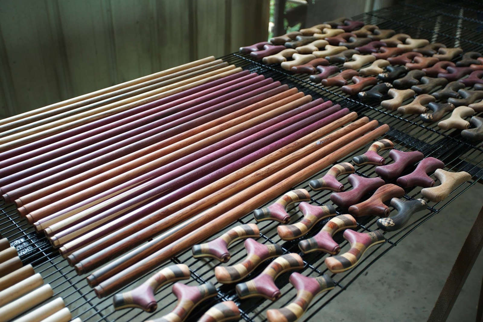 好美麗啊~~這間工廠的主要業務還是原木手杖的製作,用的木頭很多種,大家看到的這些五顏六色,大多是木頭的原色喔!很神奇是不是!現場有許多手杖還在製作中,老闆說,雖然台灣的確有手杖的需求,但因為觀念上還不普及,所以會找來的人還不多,萊富屋的手杖大多是銷往國外。