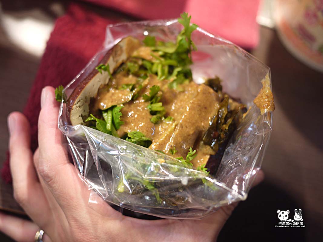 豆干刈包的內餡有扣肉、花生粉、酸菜、香菜以及一些醬料,搭配起來的味道很奇妙,屬於分層次的口感,第一層雖然看起來像是花生醬…但其實味道都是花生粉,搭配香菜吃很香,但由於花生粉的味道過重,其他酸菜就很像是陪襯品,吃不出口感。
