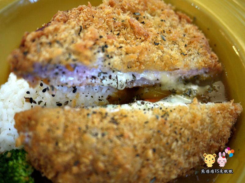 掀開豬排頗面,雖然沒有如挶拷起司牽絲般的壯觀感,卻有著濃濃的起司香撲鼻而來,一口咬下大大滿足,比較可惜的是,現在這些餐點已經沒有在遊樂園主題餐廳出現了,後面在更改的菜單中,目前還沒有吃到令熊喜歡的料理,大多是普普而已…冏。