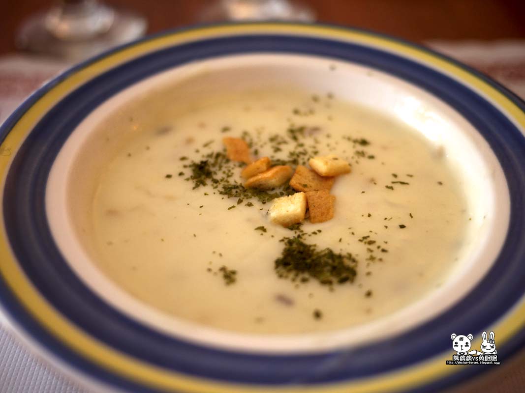 接著送上玉米濃湯,這家的濃湯喝起來很濃稠,還不錯,可配蒜香麵包吃。